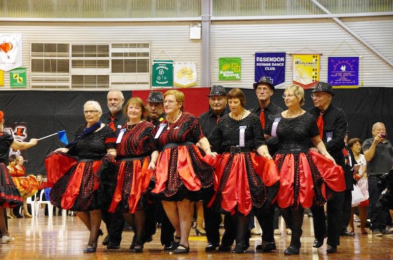 The Square Dancers of Victor Harbour recently graduated after only 10 months of dancing – you see we had 6 weeks off in December January. We started in April last year with 11 Dancers – made up of 6 Angels and 5 new dancers. This quickly grew thanks to Happy FM radio 90.1. After just three weeks we had 18 new dancers and the six Angels. On the 14th March we graduated 13 of the new dancers and three others are still dancing with us. These three are not going beyond the Basics and are happy dancing at that level. Last weekend at the National Convention we had 6 dancers and a caller represent JVCSquareDance. It goes without saying that we all had a wonderful time and have returned home absolutely Exhausted. Most of the dancers now realise that there is a new goal to be reached and this will be achieved more easily with our new Mainstream Dancing starting soon. Below is our Dressed Set at the National Convention.